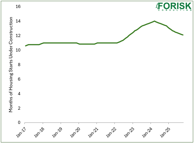 A surge in housing starts during the pandemic created a significant backlog of units under construction as supply chains and builders struggled to keep pace with demand. From 2017 through 2021, the number of housing units under construction typically aligned with an eleven-month rolling sum of housing starts (Figure 2). However, as demand peaked in 2023, completions lagged and units under construction ballooned to the equivalent of 14 months of housing starts. Over the last 27 months, the trend reversed, with completions exceeding starts in all but three months. The backlog of units under construction returned to a twelve-month rolling sum of starts in 2025 and continues to trend toward the pre-pandemic average.