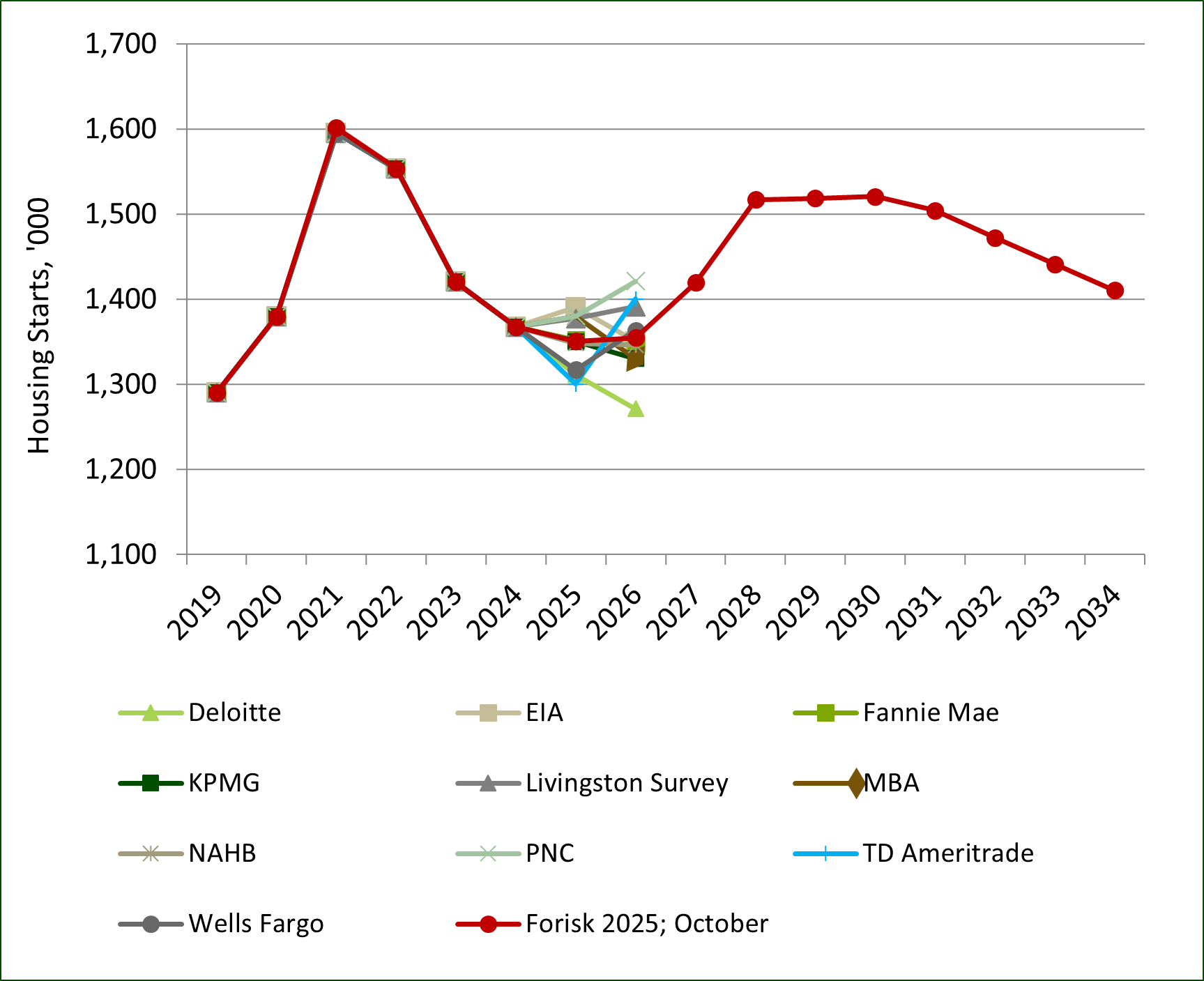 Forisk forecasts housing starts total 1.351 million units in 2025, with a similar total of 1.355 million units expected for 2026. A combination of stagflationary pressures and elevated mortgage rates are expected to contribute to limited growth in housing starts over the near-term. An average of mortgage rate forecasts reported by Fannie Mae, the MBA, the NAHB, the NAR, PNC Bank, Deloitte, and Wells Fargo suggest 30-year fixed rates will remain above 6% in 2026. Forisk projects a recovery to 1.419 million units in 2027.